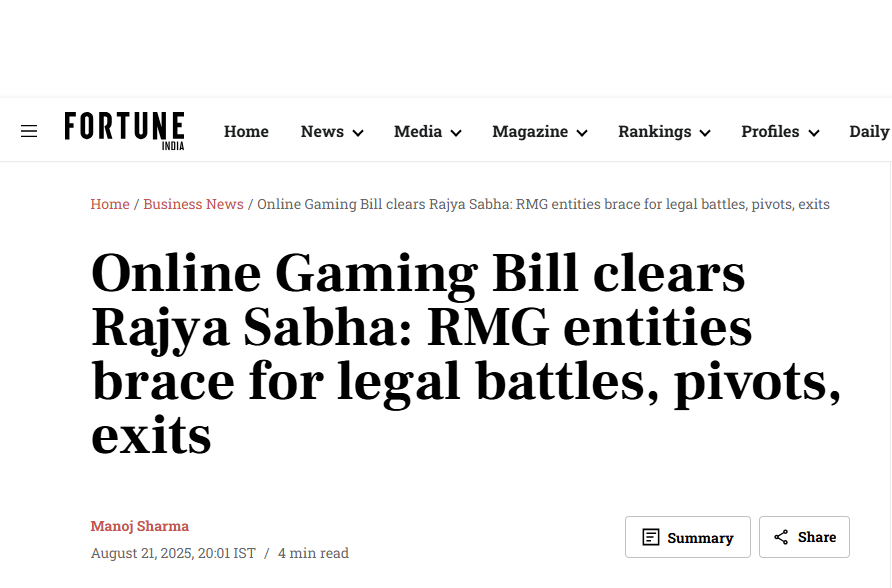 Sundeep Gupta, Baker Tilly ASA India, notes in Fortune India that the Online Gaming Bill is a significant step for the industry, underscoring the need for clarity on skill-based platforms and a balanced framework for all stakeholders.